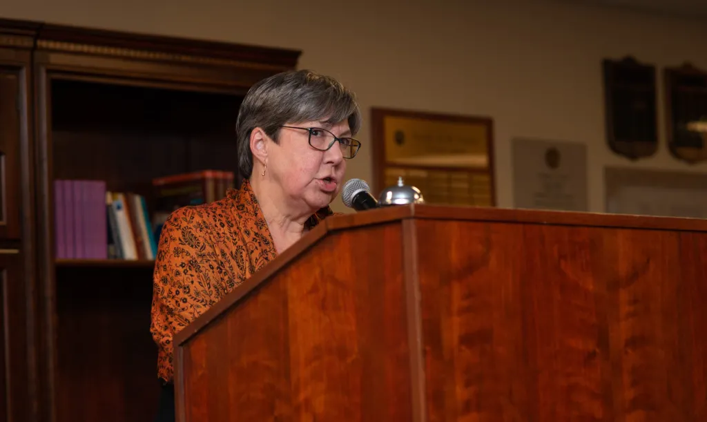 Not so for students in one particular class taught by Elizabeth DeWolfe, professor of history. Members of her What Really Happened? Women, Witches, and Witch Hunts class were, indeed, thinking about witches on Oct. 31 — but in an entirely different and far more serious context. Gathered in the Saint Francis Room on the afternoon of Oct. 31, the class’s 14 students, grouped into five teams, presented a modified Oxford-style debate to the UNE community to put forth possible historical explanations for the tragic events that occurred in the early 1690s in Salem Massachusetts — events involving the investigations and persecutions of people suspected of being “witches” and resulting in the imprisonment of more than 150 people and the execution of 20.