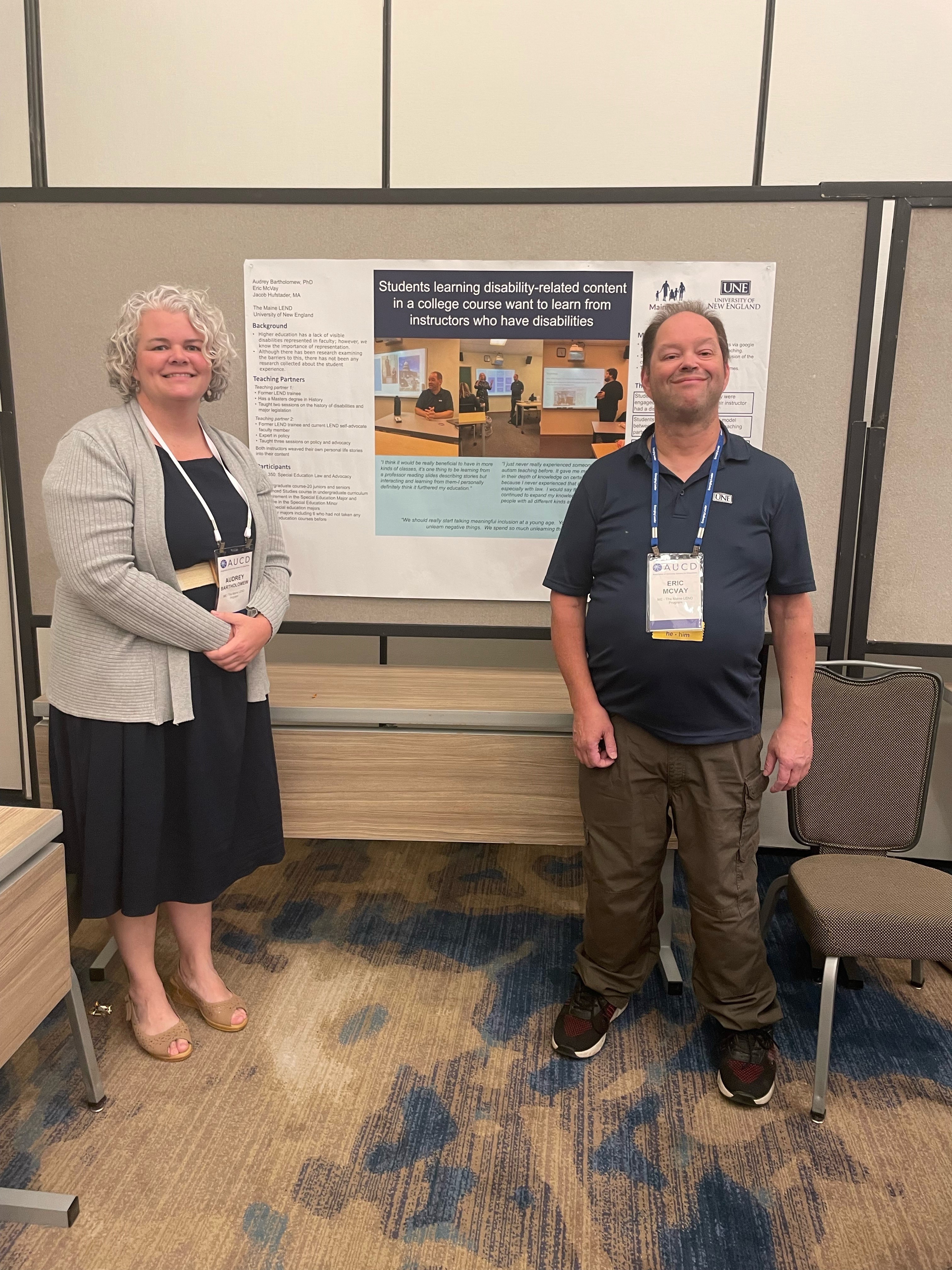 Bartholomew’s second poster described the results of a research study she conducted last spring in an undergraduate course in Special Education Law and Advocacy, in which she partnered with two teaching partners with disabilities who had expertise relevant to the course outcomes. She was joined by one of the teaching partners, Eric McVay, also faculty for the Maine LEND as the self-advocate mentor.